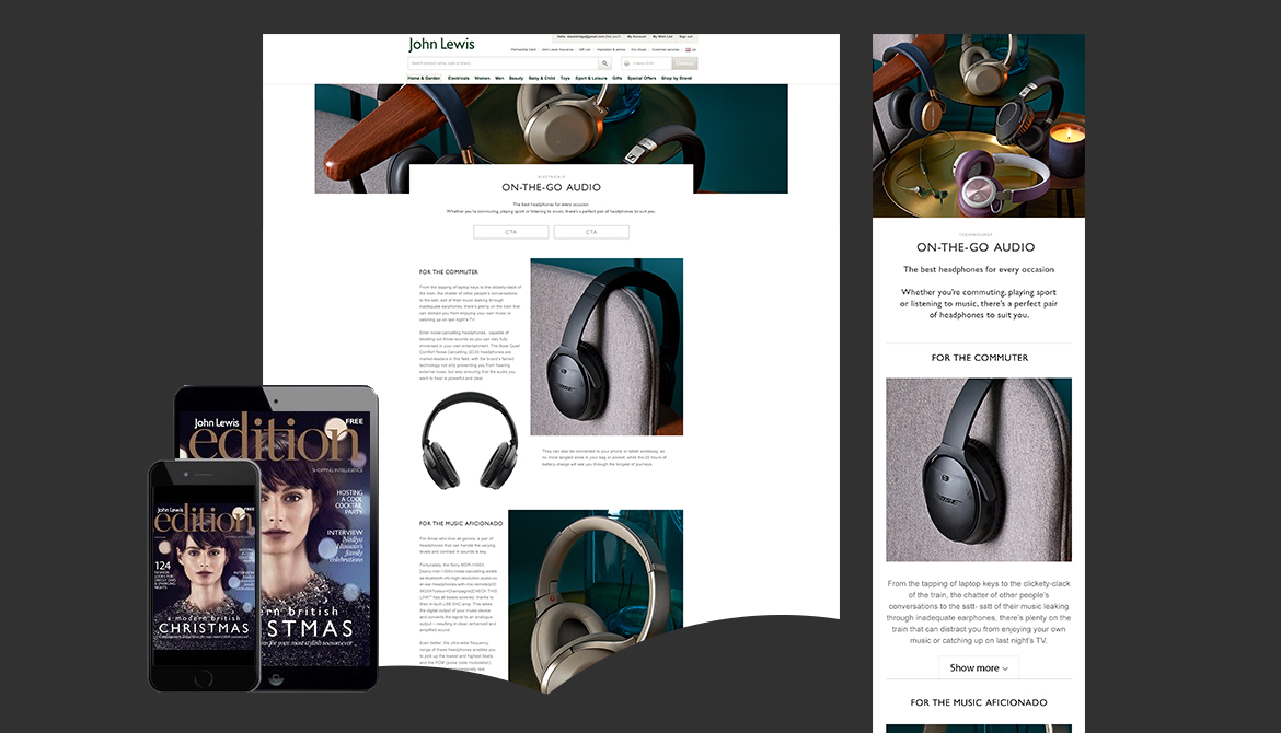 As the lead designer for John Lewis's technology department, I create the online editorials, as well as working closely with the photography studio and printed magazine. We collaborate to launch this seasonal magazine, alonside its tablet app, to promote our in-house style.