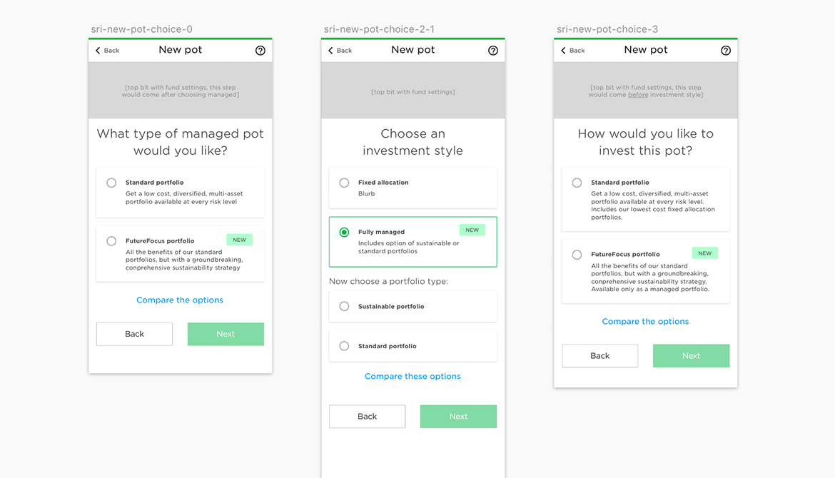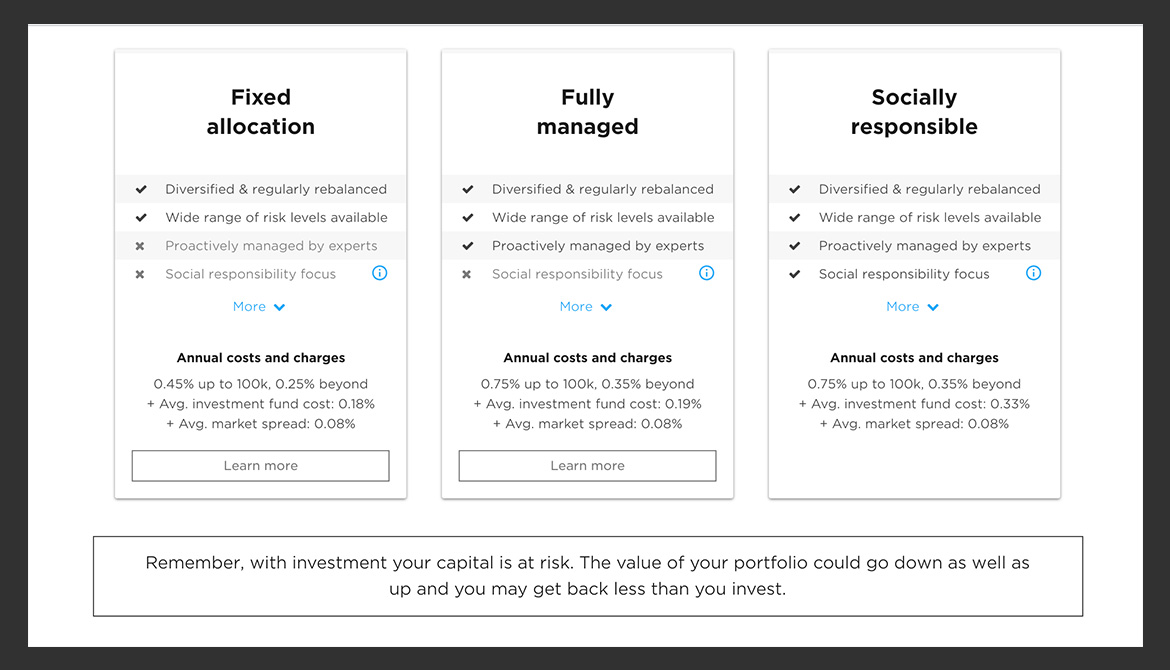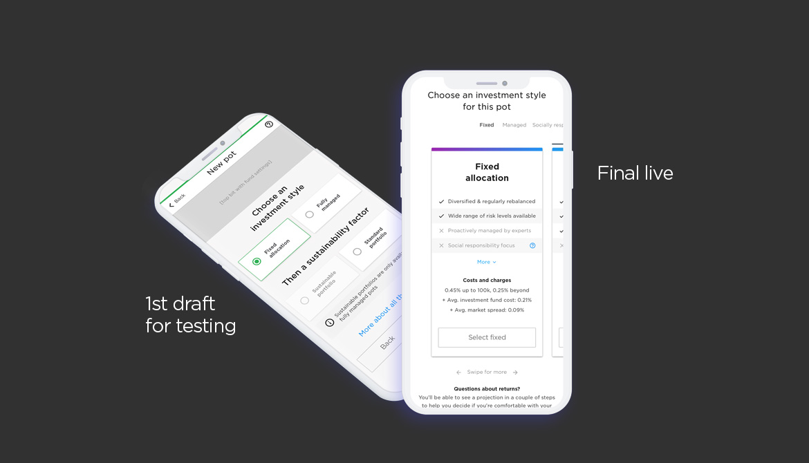This involved many challenges, from how to market and talk about this investment style, updating the current account and dashboard area to visualise, and create a new on-boarding journey. All of this came with the constraint of not being able to talk down our other investment styles, or favour responsible investing over anything else.