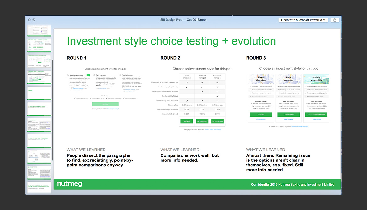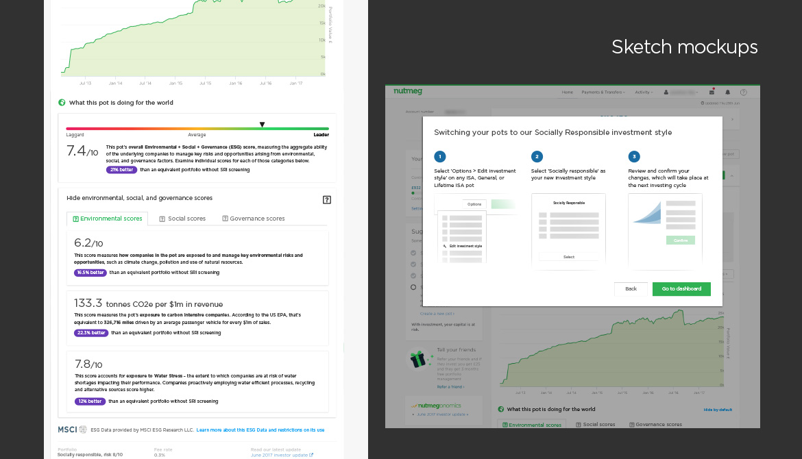 At Nutmeg I was tasked with leading the creation of a new investment style. This covered interviewing customers, testing ideas across channels, and creating a user journey on top of an already existing platform.