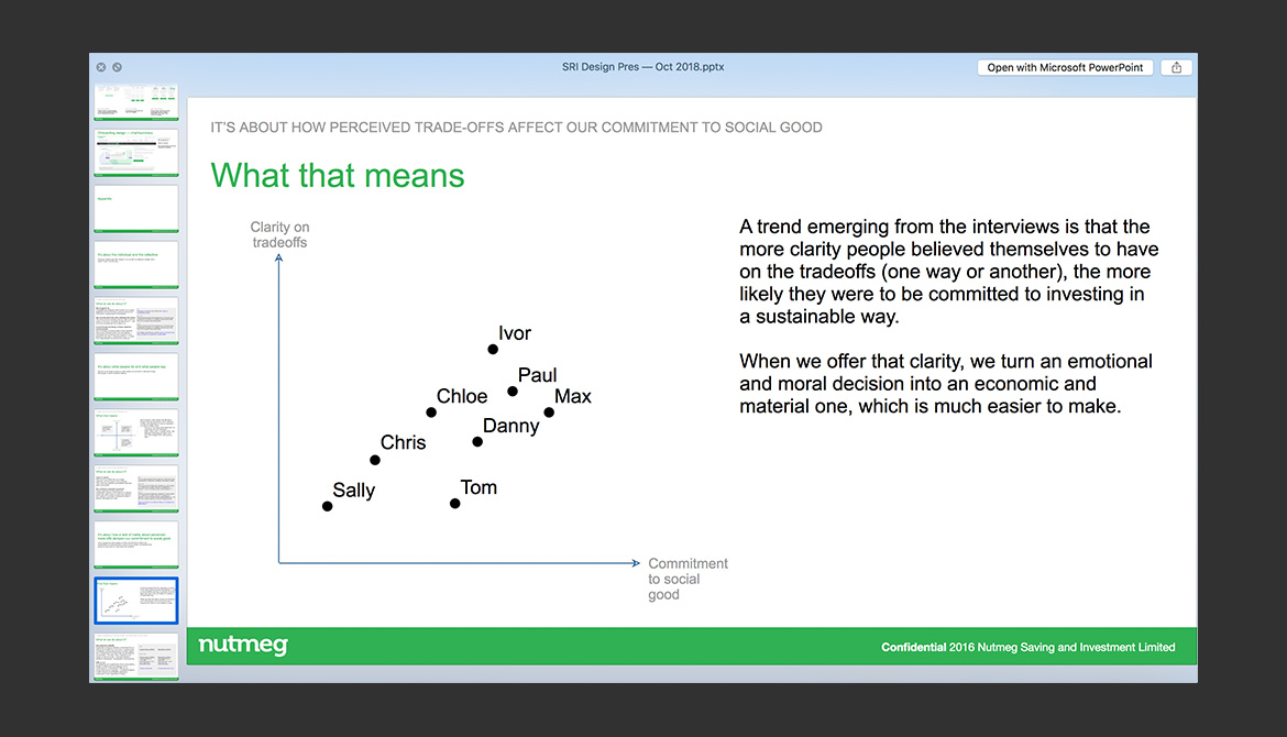 After a successful launch, the new style slowly gained traction. The next stage is to work on improving the data available to show to customers, which is only possible after several months of investments. The one thing learnt was that interviewees can provide skewed data. Almost all said they would invest in SRI, however when live, and it was clear financially it was not their best option, many decide that they are not willing to compromise their money for the greater good.
