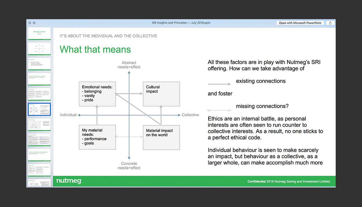 Current investors have no visibility of what they invest in. It is well known that the best portfolios don’t have your best interests at heart other than finances. Nutmeg wanted to be able to let customers choose to invest in companies that are more responsible, and show what their money is doing.