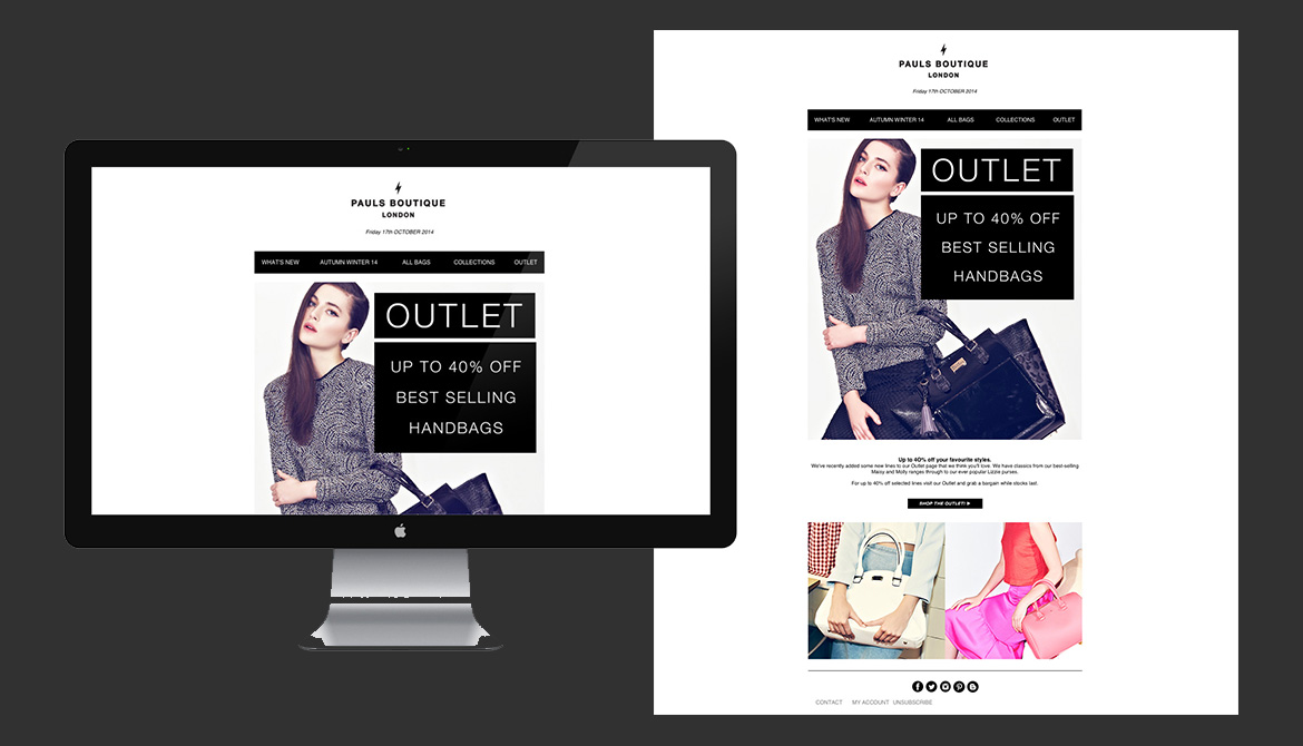 I was brought in to assist Pauls Boutique's internal design team. I worked directly with them to be train junior staff on email design & coding. During this time I also helped them through a re-brand as they were looking to move to an up-market clientel.