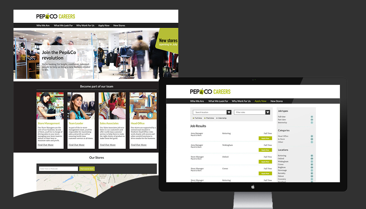 Pep&Co was a brand new retail chain, which launched 50 stores in the space of 4 months. I desigined and built the recruitment portal on wordpress for the company, so they could hire a mass of staff and build the brand. This then became part of the online brand site which I built along with instore advertising and labelling.